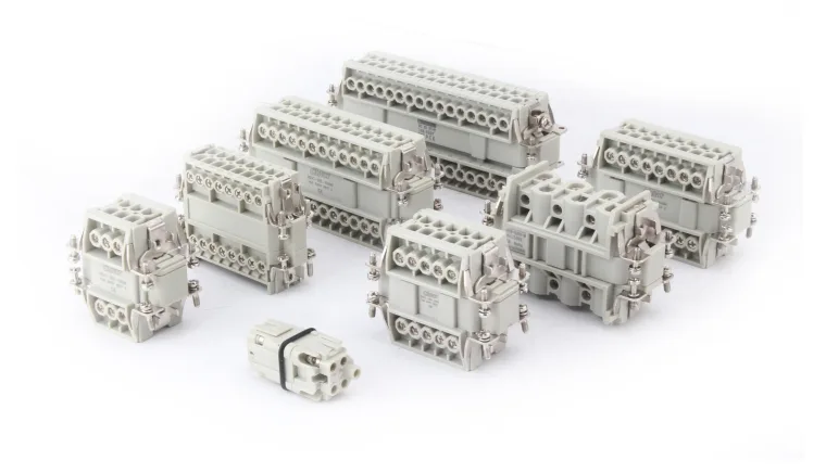 Konektorji za težke vložke delujejo tako, da zagotavljajo nizkoodporno in zanesljivo pot za električni tok (moč) ali signale med kablom in opremo priključka za parjenje. Za fizično pritrditev žice ali kabla tiskanega vezja, s čimer zagotovite, da povezava ostane nedotaknjena pod vibracijami, udarci in ponavljajočimi se cikli spajanja. Ustvarijo standardiziran, ponovljiv vmesnik med opremo ali kabelskimi snopi, kar poenostavi proizvodnjo in vzdrževanje. Izolacijsko ohišje okoli sponk zagotavlja električno izolacijo med poli (preprečevanje kratkih stikov) in ščiti kontakte pred fizičnimi poškodbami med rokovanjem.